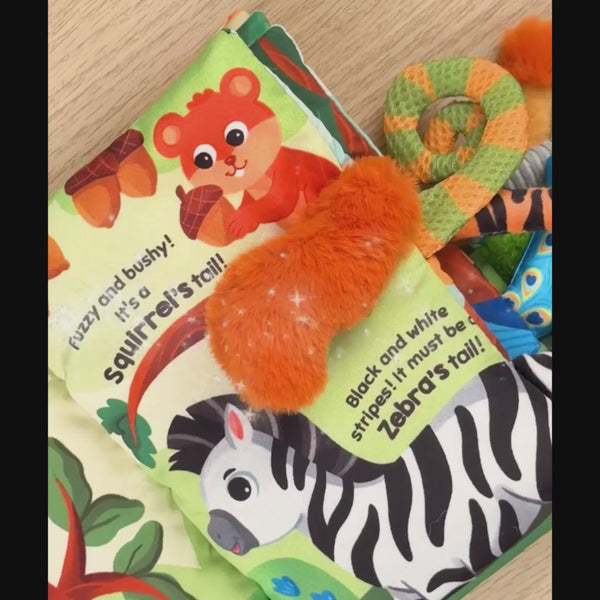 • 1 interactive sensory cloth book (21cm x 15cm) featuring 5 colourful pages and 10 animal tails for tactile exploration.